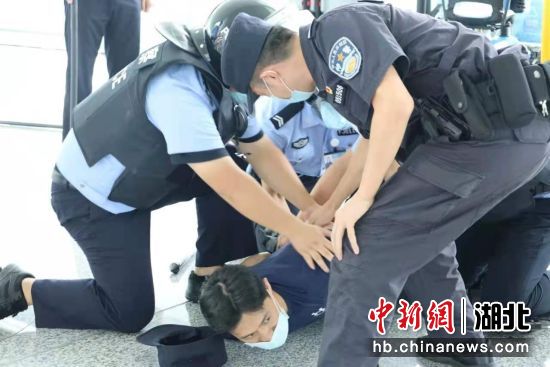 中新网湖北新闻8月9日电 (刘前浩 汪野)“趴着别动!”看着民警终于将“歹徒”制服,夺下手中的“凶器”,现场群众终于松了口气。原来,这是荆州市公安局荆州沙市机场分局开展的模拟警情演练。