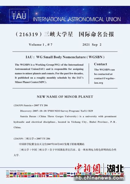 中新网湖北新闻5月25日电 (汤婧)5月25日,三峡大学收获了一份珍贵的“生日礼物”——一张“星空名片”。当日,“三峡大学星”命名发布仪式在线上线下同时举行,中国科学院紫金山天文台台长赵长印、副台长吴雪峰,三峡大学党委书记何伟军、副校长陈和春,党委常委张锐、张成出席活动。