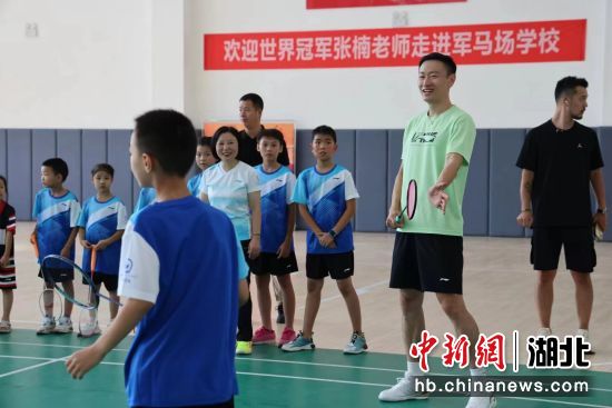 中新网湖北新闻9月6日电 (周哲 何雨仙)9月2日上午,奥运冠军张楠走进荆门市掇刀区军马场学校与学校师生进行交流互动,参与羽毛球现场教学,与孩子们“过招”。