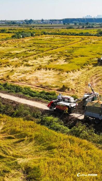 中新网湖北新闻10月24日电 (周璜 杨铭)金秋时节,武汉市蔡甸区田间地头处处洋溢着丰收的喜悦,14.65万亩水稻进入集中收割期,广袤田野间稻浪翻滚,机械轰鸣,农户们正抢抓晴好天气,全力抢收确保颗粒归仓。