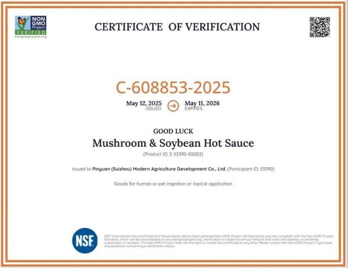 时间轴清晰勾勒出这款中国辣酱的出海轨迹:2024年3月,品源(随州)现代农业发展有限公司与美国华人商会签下首笔出口订单,带着“中国红”基因的香菇辣酱凭借“一餐一罐”的健康理念,迅速在美树立了较好口碑。今年5月12日,四张印有蝴蝶标志的证书跨越重洋——该品牌四款产品通过全球最严苛的美国Non-GMO Project非转基因认证,为进入主流商超扫清关键障碍。