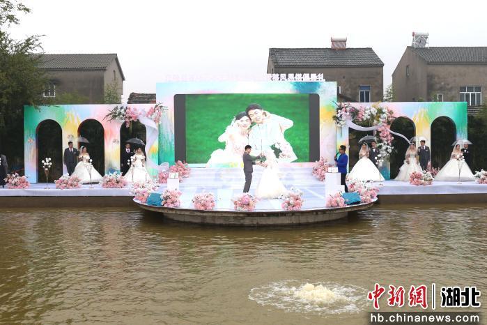 中新网湖北新闻10月26日电(唐华 陈理君)“荆生荆世·爱在江陵”之“艺绘荆江·情定江陵”集体婚礼25日在陈泽鲲长河艺术馆浪漫落幕,近百名青年男女与亲友团现场见证了6对新人简约而温馨的婚礼。
