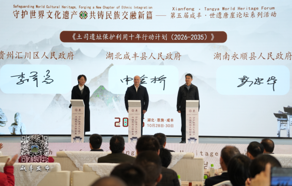10月29日,第五届“咸丰·世遗唐崖论坛”开幕。本次论坛恰逢唐崖土司城址申遗成功十周年,以“守护世界文化遗产共铸民族交融新篇”为主题,汇聚多所高校、研究机构的专家学者以及秘鲁、墨西哥等外籍专家、文旅系统及媒体代表,共同探讨世界文化遗产保护利用的路径和方向。