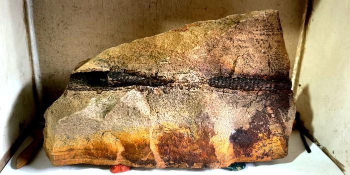 走进孙军家中,展柜上各种画面石令人目不暇接。其中,非常有特点的一块石头是:石体中,一根“螺纹钢”穿越其中,栩栩如生。这块酷似螺纹钢的柱状化石,据称形成于3亿年前,专家分析认为该物质与震旦角石等生物化石相关,但具体成因尚无定论。