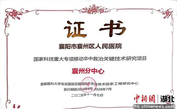 中新网湖北新闻11月8日电 (吴昱晗 程宇虹)2025中国脑卒中大会7日在北京召开。会上,襄阳市第六人民医院(襄州区人民医院)神经内科获批成为“国家科技重大专项移动卒中救治关键技术研究项目襄州分中心”,标志着该院卒中救治能力与国家顶级医疗机构实现接轨,并成功接入国家卒中救治网络。