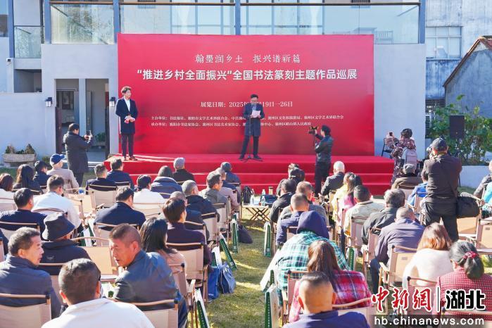 中新网湖北新闻11月19日电 (褚康兵 范小青)全国书法篆刻主题作品巡展暨“乡村书法潮”活动19日在湖北省襄阳市襄州区峪山镇金寨村开幕,聚焦乡村振兴战略,以书法篆刻艺术展现乡村文化底蕴、自然风貌及发展成果,通过艺术赋能乡村,推动文化振兴与产业融合。