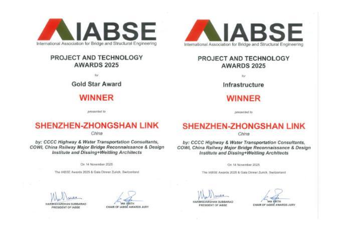 近日,国际桥梁与结构工程协会(IABSE)2025年度“IABSE Project and Technology Awards”颁奖典礼在瑞士苏黎世圆满落幕。由中铁大桥勘测设计院参与勘测设计及施工监理的深中通道项目,凭借卓越的工程创新成果、顶尖的建造品质标准及深远的行业示范影响,成功斩获“杰出基础设施奖”,并荣膺象征协会最高荣誉的“金星奖”,成为本次评选的全球焦点,充分彰显了中国桥梁工程技术的国际领先地位。