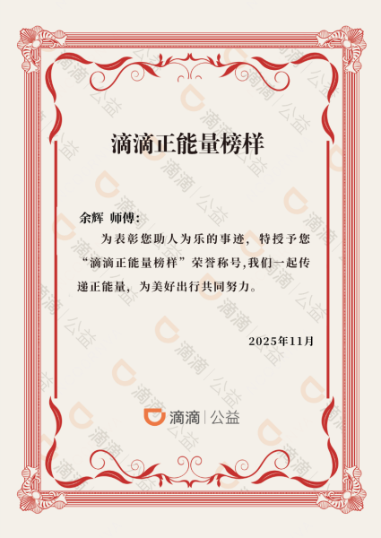 为表彰余辉的见义勇为行为,滴滴公司特别授予他“滴滴正能量榜样”称号。这位“榜样”的暖心之举远不止紧急救援:5年来,只要拾到乘客遗失物品,无论价值高低、距离远近,他总会第一时间送还,从不推诿;面对情绪不佳的乘客,他总能耐心倾听、温和回应,把每一位乘客都当作朋友对待。“服务多一分贴心,乘客就多一分安心”,这是他常挂在嘴边的话,也让他收获了无数乘客的信赖与认可。