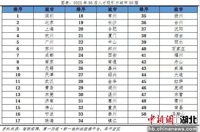 中新网湖北新闻12月1日电 (白雪)近日,智联招聘联合泽平宏观发布《中国城市95后人才吸引力排名:2025》报告,聚焦“95后”求职群体流动特征,既揭示青年人才向东部发达区域、重点城市群集聚的核心趋势,也展现中部城市在人才竞争中的稳步突破,为全国城市人才政策制定提供重要参考。