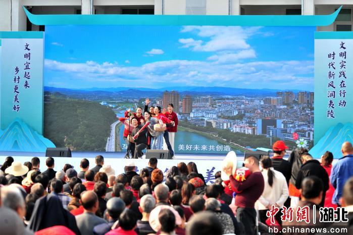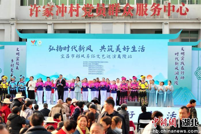 中新网湖北新闻12月18日电 (张国荣)湖北省宜昌市以“弘扬时代新风 共筑美好生活”为主题的移风易俗文艺巡演活动17日在夷陵区太平溪镇许家冲村举行。活动将移风易俗融进歌舞、小品、曲艺里,让文明理念在欢声笑语中入脑入心,现场还有爱心义诊、义剪、义拍等文明市集,倡导大家争做文明新风的实践者和传播者。