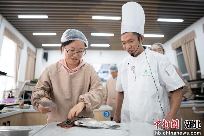 据介绍,《饮食文化与美食制作》课程共分为八个章节,围绕湖北饮食文化与热拌菜制作、沔阳三蒸、红烧武昌鱼、排骨藕汤、食堂劳动教育、中式面点、西式烘焙及技能展示等内容,采用“理论讲解+示范操作+分组实践”的教学模式展开。