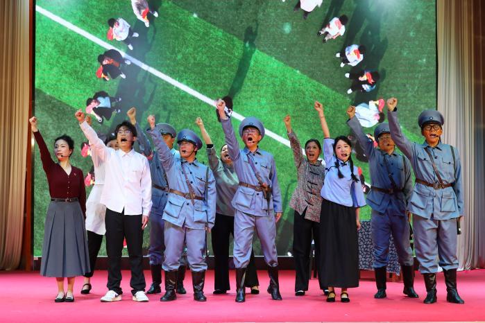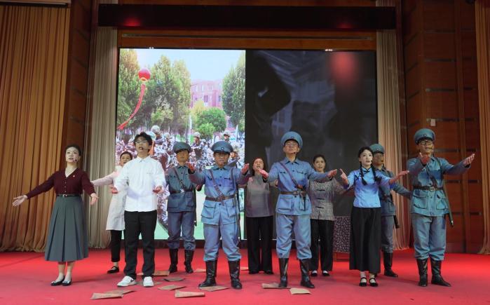 舞台上,学生昊燃站在学校校史角,向手拿《首义文化论纲》的王老师提问:“王老师,您总说‘首义精神’是我们学校的根与魂,可1911年的那场武昌起义,到底蕴藏着怎样的青春力量?”王老师目光望向远方:“这不是一段遥远的历史,而是与我们脚下这片土地紧紧相连的担当。110多年前,武昌城的一声枪响,打破了千年帝制的沉寂,那群和你们一样正值青春的人,用勇气和信念,点燃了民族觉醒的星火。而我们武昌首义学院,正是传承这份星火的沃土。”昊燃追问道:“他们是谁?明明知道前路凶险,为什么还要挺身而出?”王老师微笑道:“他们是学生、是工人、是普通士兵,更是心怀家国的中国人。看,他们用青春诠释着‘首义’二字。”