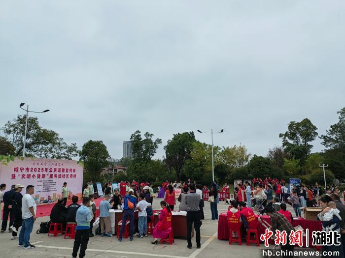 2025年11月22日下午,同惠国际广场上,学府社区联合“文明小货郎”实践项目开展的友邻文化节场面热烈。由咸宁市公关协会、咸宁义工协会、湖科口腔医院、咸宁镇万胜风湿医院等单位组成的“文明小货郎”摊位热闹“开张”。