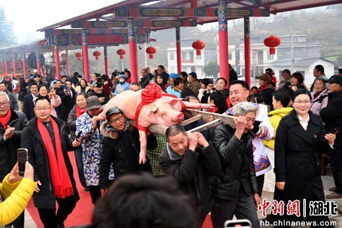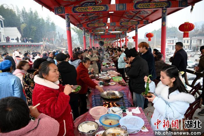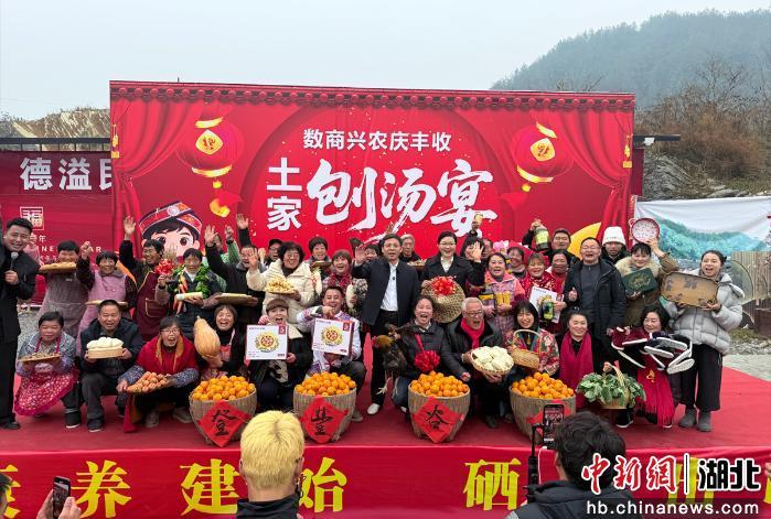中新网湖北新闻1月19日电 (税浪 向继武 李贤锋)一场由全国巾帼标兵、返乡创业企业家秦娥自费操办的“土家刨汤宴”,18日在建始县业州镇乐家坝村德溢民生态农业广场举行。活动以“数商兴农庆丰收”为主题,吸引了来自全国各地的网红主播、游客及周边村民共2000余人欢聚,大家载歌载舞共赴一场烟火氤氲的乡土盛宴。