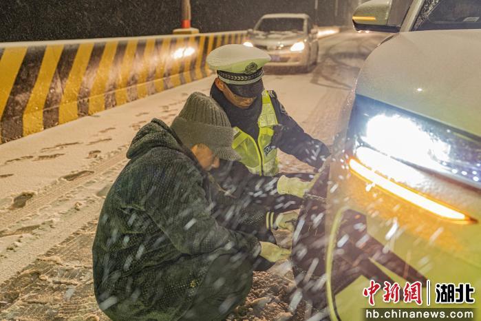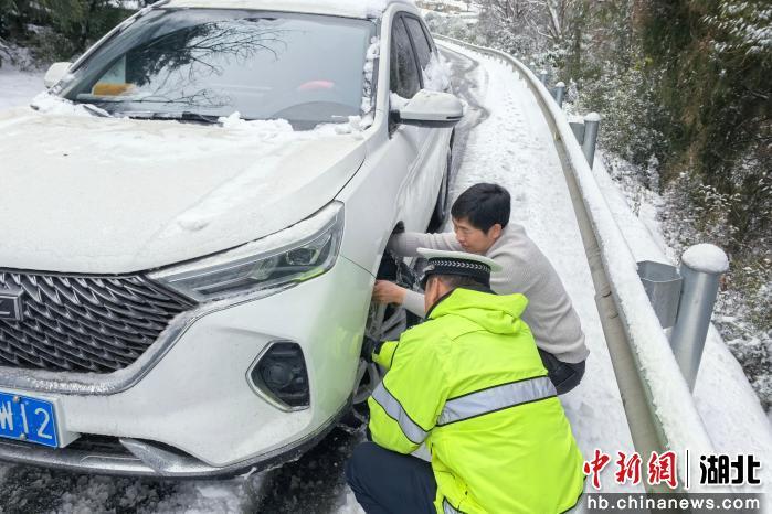 长阳交管民辅警帮助过往车辆安装防滑链。宜昌交警供图
