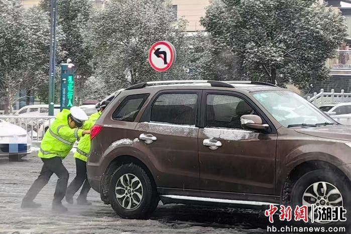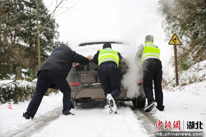 民辅警在远安县茅坪场积雪结冰路段疏导交通。宜昌交警供图