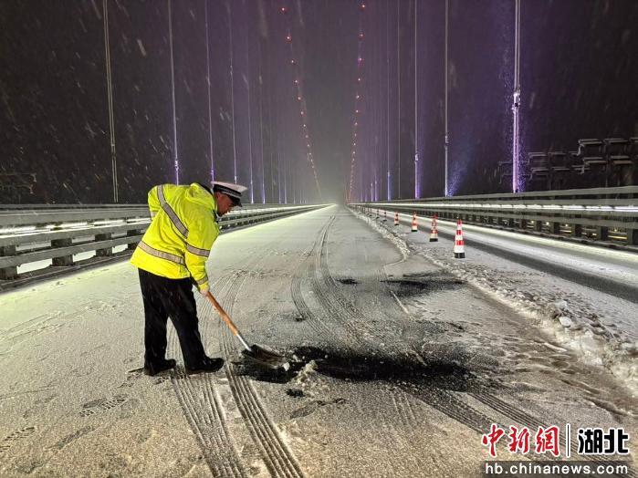 1月19日晚至20日,宜昌迎来大范围降雪,为保证交通安全,宜昌市公安局交管支队提前部署,以雪为“令”,积极组织民辅警奋战一线,全力开展抗冰除雪保畅通工作。(完)