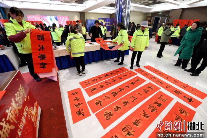 27日上午,活动伊始,一场公益笔会率先登场。来自咸宁市美术馆的10余位书画艺术家现场挥毫泼墨,一副副饱含美好期许的春联、“福”字与“马”字接连诞生,当场逐一送到环卫工人手中。“往年都买印刷的春联,今年拿到书法家亲手书写的,感到特别有纪念意义!”环卫工人祝晓玲手捧墨香未散的春联,脸上洋溢着幸福的笑容。