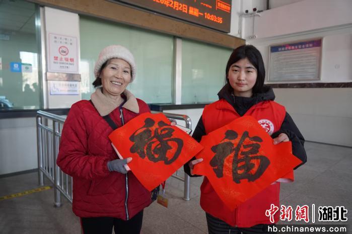 启动仪式结束后,平顶山站书法爱好者在售票厅现场挥毫,为旅客义写春联、福字。党团员突击队队员们将带着墨香的春联送到旅客手中,送上新春祝福。务工旅客接过春联后笑着说:“这春联外面买不到,让我们提前感受到了‘年’味和家的温暖!”