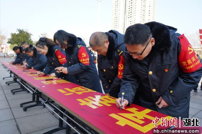 车站党委为党团员突击队代表授旗。党团员代表宣读倡议书,平顶山站干部职工及公安干警共50余人集体宣誓:“牢记担当、为民服务……实现平安春运、有序春运、温馨春运,让旅客体验更美好。”铿锵誓言响彻广场,全体人员随后在春运横幅上签字承诺。