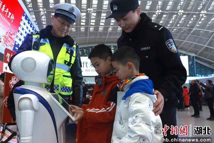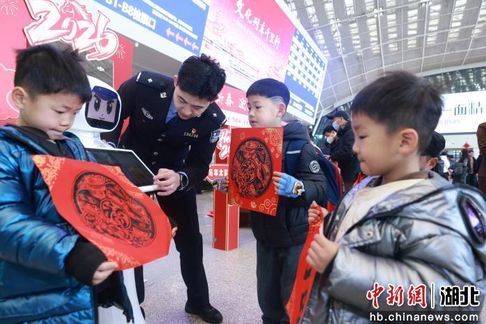 “这张新年挂历您拿好,里面还有反电诈宣传。”2月2日上午,武汉铁路警方联合武汉铁路宣传部在汉口火车站组织开展了“平安春运、有序春运、温馨春运”主题宣传活动。警用装备展示、警犬表演、舞狮、送福、预防网络电信诈骗及安全出行常识宣传……各种宣传活动在武汉各大客运车站上演,吸引了众多旅客驻足观看。“看着舞狮、送福,年味一下子就来了”一名在汉大学生观看活动后不由自主的感慨道。