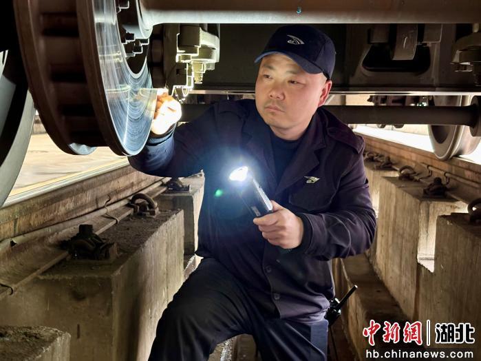 中新网湖北新闻2月4日电 (王世龙)2月4日上午8点,武昌客车车辆段汉口运用车间整备场上停满了一趟趟动集动车组。动检班党员罗力蹲在D38次列车车底下,手持摄像电筒仔细检查转向架的每一颗螺栓。