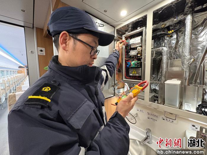 一旁的车厢内,喻可单膝跪地检查座椅调节功能。他身后,20排座椅的靠背角度都被调整到统一位置。“每个按钮都要调试,每处螺丝都要看。”喻可说,“春运期间旅客的舒适出行就要从这些细节做起。”