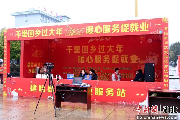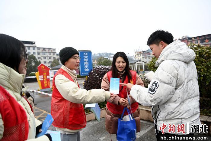 中新网湖北新闻2月10日电 (向继武 朱方慧 高运平)2月9日,大雪纷飞,湖北建始县火车站却暖意融融。一场由县总工会、人社局等多部门联合举办的“千里回乡过大年·暖心服务促就业”活动在此启动,为返乡农民工送上热气腾腾的姜茶、年货以及满载岗位信息的“新春大礼包”。