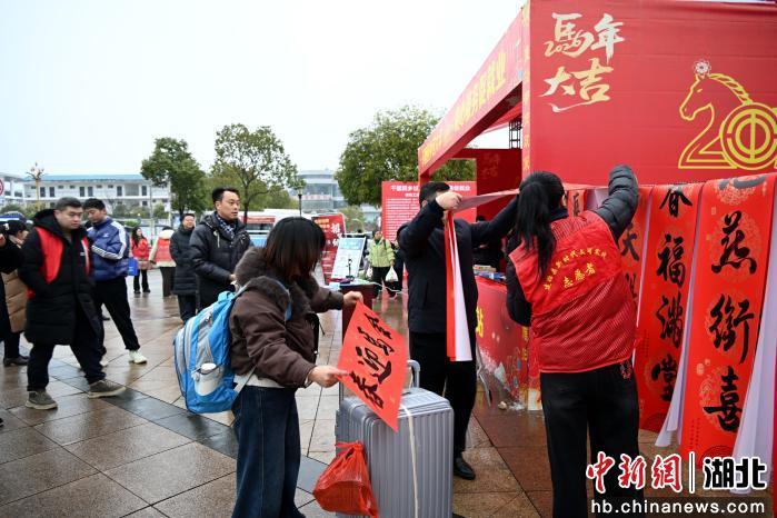 上午10点,首趟从杭州驶来的列车抵达建始站。出站口处,志愿者们早已守候,将一杯杯姜茶、一份份点心递到旅客手中,同时发放春联与就业信息手册。不少返乡人脚步匆匆,脸上洋溢着回家的喜悦。