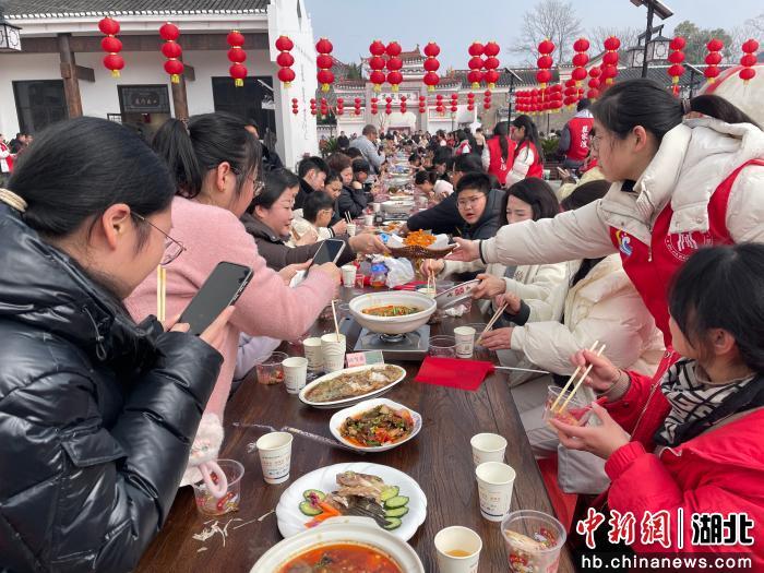 中新网湖北新闻2月12日电(吴淘淘 郑钟)2月11日,正值小年,洪湖市瞿家湾湘鄂西革命根据地旧址热闹非凡,一场别开生面的全鱼宴活动在此举行,吸引来自全国各地的游客齐聚,共赴一场充满年味与红色温情的盛会。