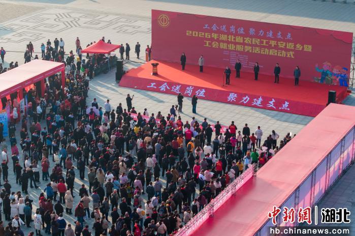 中新网湖北新闻2月13日电 (蒋俊宏 刘睿喆 吴少婷)“工会送岗位聚力建支点”——2026年湖北省农民工平安返乡暨工会就业服务活动启动仪式2月12日在枣阳市高铁站站前广场举行。