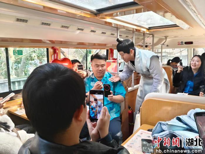 试乘活动当天,印有“妙遇汉阳 知音共鸣”字样的红色观光巴士9:30从黄鹤楼阅马场公交站准时发车,市民游客扫码即可免费乘坐,还能在现场领取定制纪念车票。车厢内欢声笑语,红气球点缀其间,新春氛围扑面而来。