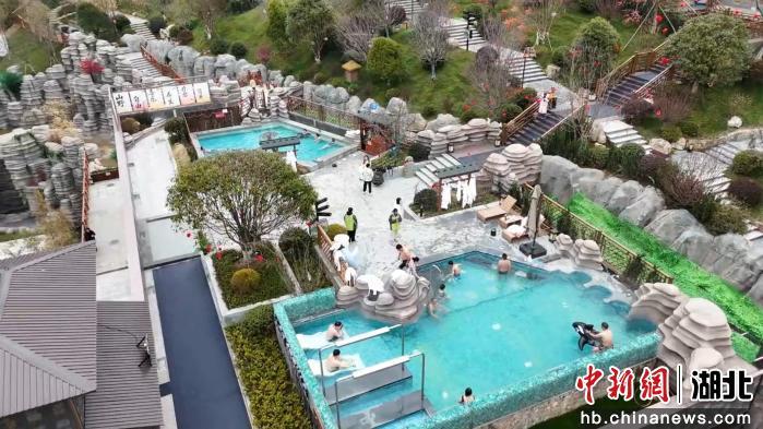 在茅田乡的温泉小镇,来自武汉、重庆、北京及东北等地的游客们卸下厚重的冬衣,惬意地浸泡在富含“锶”元素的温泉中。这些温泉水采自地下2600米深处的岩层。48个功能各异的泡池依山就势,散落在林间。抬眼望去,远山如黛,层林尽染冬意,宛如一幅流动的山水画卷。