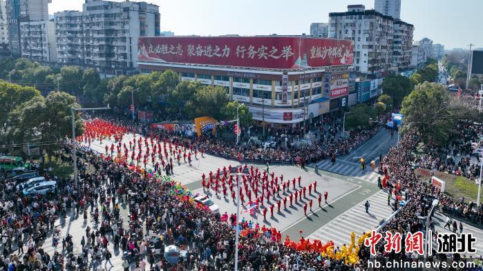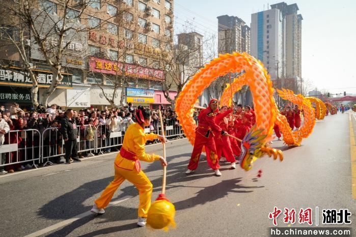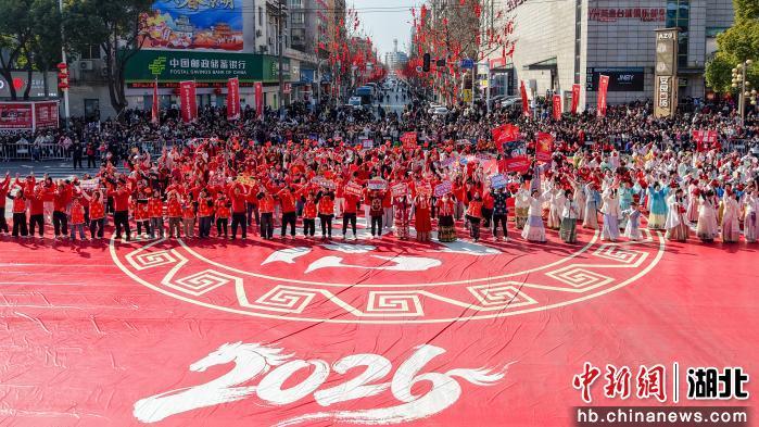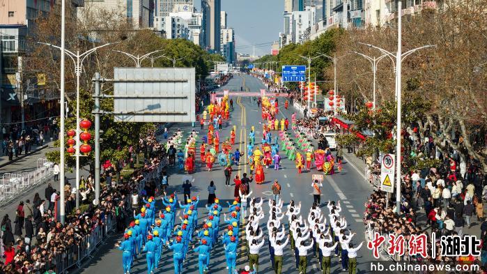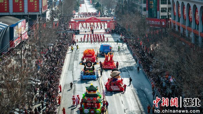 2月21日农历正月初五上午,湖北省荆州市沙市区北京中路鼓乐齐鸣、人潮涌动,2026沙市春节民俗嘉年华热闹上演。上午10时10分,由舞龙表演队及国家级非物质文化遗产代表性项目“五虾闹鲇”领衔的巡游队伍,沿市中心主干道行进。梅花桩舞狮、登高采青等环节将现场氛围推向高潮,让民众在沉浸式体验中感受荆楚民俗的独特魅力。(吴淘淘 摄)