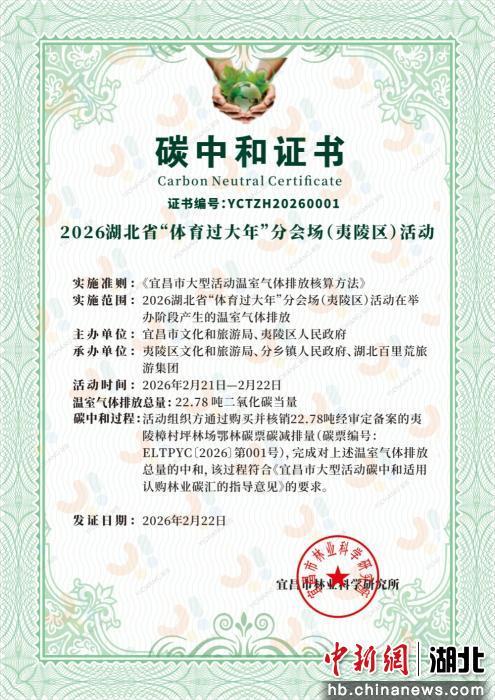 中新网湖北新闻2月23日电 (周丹 周金华)2月21日至22日,2026年湖北省“体育过大年”分会场活动(宜昌市夷陵区)在百里荒滑雪场举行。活动创新融入“冰雪+体育+年味+低碳”元素,通过认购夷陵樟村坪林场鄂林碳票22.78吨二氧化碳当量,精准抵消全流程温室气体排放,成功实现碳中和。