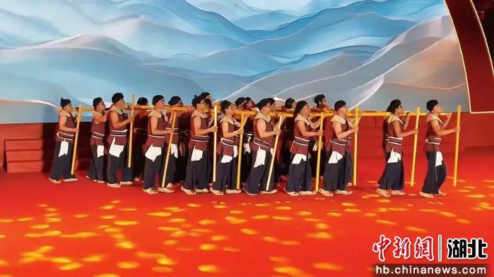 舞台上,非遗技艺被演绎成诗意长卷:劳动号子诠释先民智慧,民歌与丝弦锣鼓交织出浓郁民俗韵味;鼓乐类节目气势如虹,擂响新春奋进的号角。婚俗文化节目《陪十姊妹》延续土苗千年文脉。以出土国宝“东汉青铜双虎钮錞于”为灵感的情景舞蹈《虎啸》,一声穿越千年的“虎啸”,奏响民族交融与文明互鉴的宏大叙事,尽展土家儿女的热情豪迈。