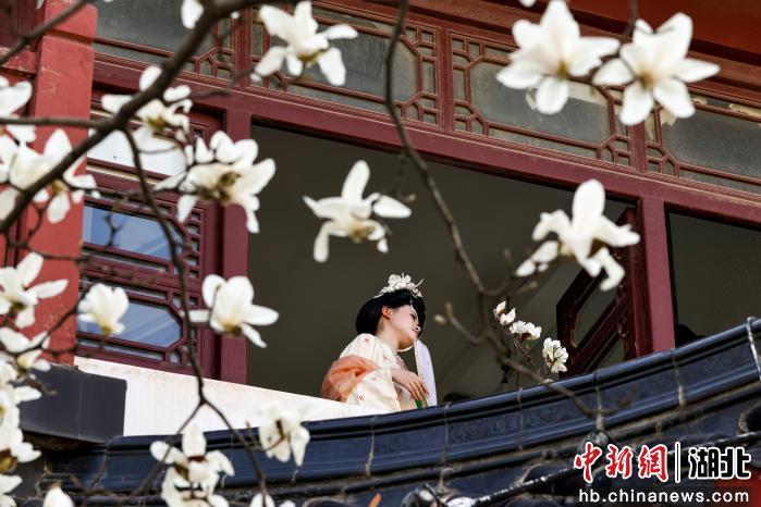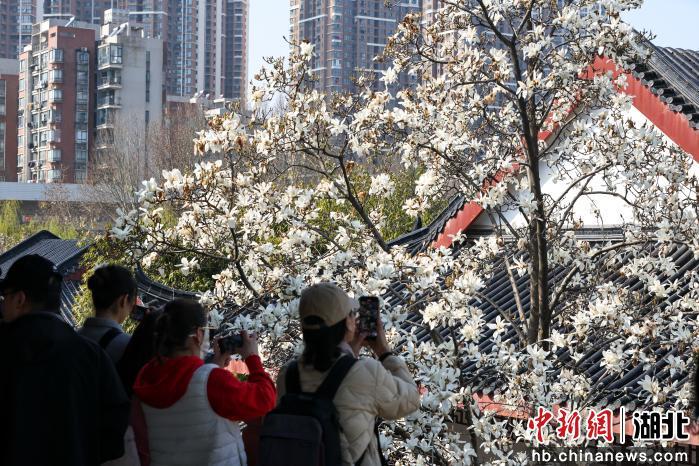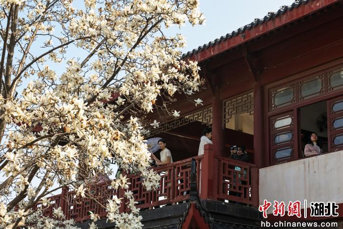 图为白玉兰与仿古建筑同框,吸引游客拍照留影。张畅 摄