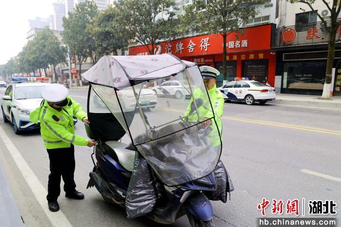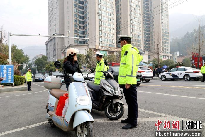 中新网湖北新闻3月16日电 (欧阳智慧 李辉敏)“同志,请靠边停车,戴好头盔再骑行,安全出行切勿心存侥幸!”3月16日清晨,在湖北省襄阳市保康县城清溪路路段,执勤交警正对一名未按规定佩戴安全头盔的电动车驾驶人开展现场劝导。