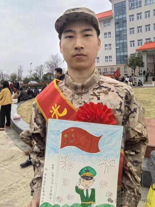 欢送现场,老师们为雷登胜戴上“光荣入伍”的绶带和红花,送上鲜花、路费和手提包。有的老师轻抚着他的背和手臂,眼眶湿润;有的则笑容满面,满眼骄傲。雷登胜话语不多,略显腼腆,但每当家人为他佩戴上一样物品,他便庄重地敬一个军礼,认真的模样逗得家人们笑语连连。