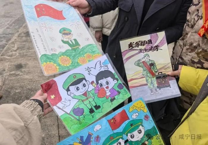 “哥哥,以梦为马,不负韶华,祝登胜哥哥是最帅的兵。”“参军报国,无上光荣。”一同生活的三个妹妹送上亲手绘制的画作,色彩斑斓。老师们特意为画作塑封,方便保存。