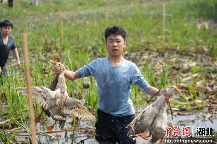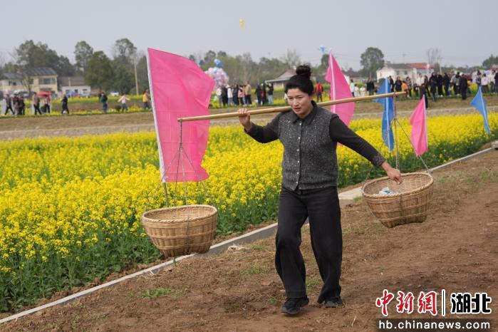 活动现场,一场摆在油菜地里的乡村时装秀“嗨”翻全场,泥地捉鸭、农人三项、土味拔河等沉浸式乡土体验活动,让游客零距离体验乡土乐趣。当阳好礼展销区现场人头攒动,郭场鸡、长坂坡土榨菜籽油、新鲜果蔬等农特产品深受游客青睐。