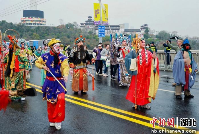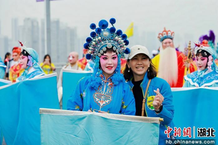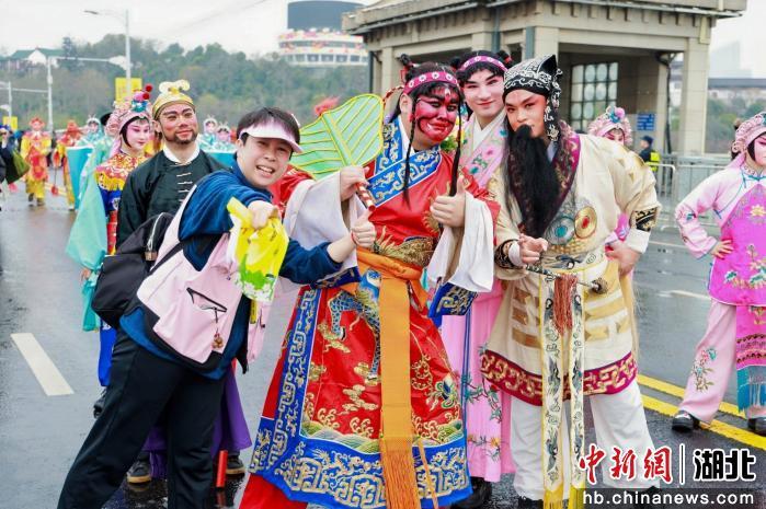中新网湖北新闻3月22日电 往年汉马专属武汉长江大桥赛道,而今市民游客也能欢乐打卡。3月22日上午,随着汉马参赛选手跑过,武汉长江大桥“嘉年华”开场——百名中外演员构成巡游队伍,演绎京楚汉剧和热情歌舞,数千名市民游客用脚步丈量大桥,纷纷留影记录欢乐时刻。