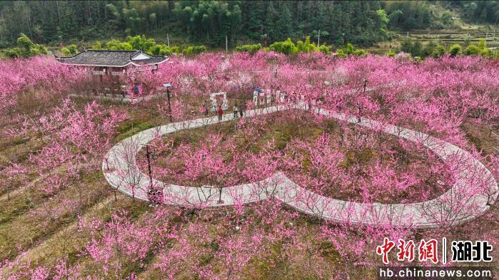 中新网湖北新闻3月24日电 (邓明安)春风拂过武陵山区,湖北省来凤县三胡乡杨梅古寨4A级景区内的石桥村桃花岛,迎来一年中最美时节。百亩桃林次第盛放,粉白嫣红交织成画,青山碧水与烂漫花海相映,成为鄂湘渝边区春日踏青赏花的热门目的地。