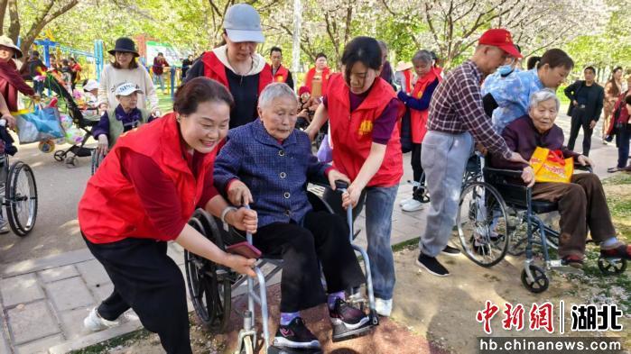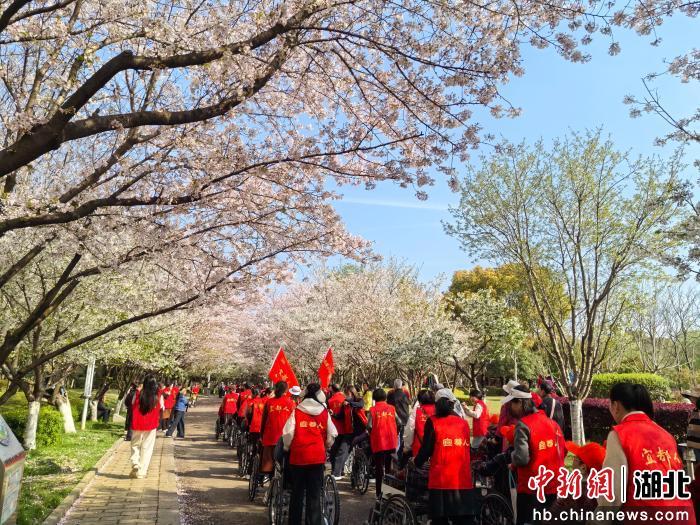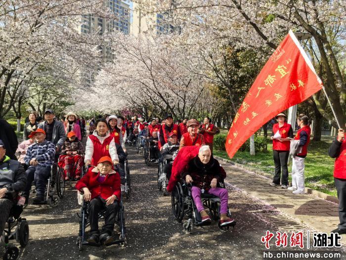 中新网湖北新闻3月28日电 (黄彪)宜都人志愿服务队27日走进康馨优养医院,与护理员、护士们紧密配合,细心搀扶行动不便的长者,平稳推送轮椅,一路护送他们前往文峰公园樱花大道,开启“最美樱花季,情暖夕阳红”春日赏樱之旅。