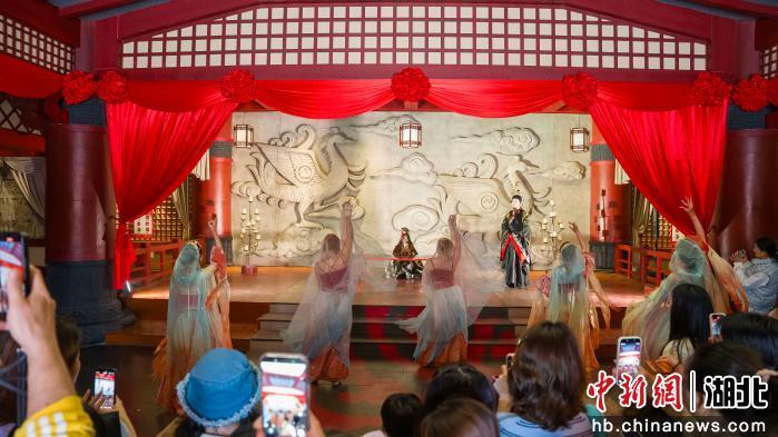 荆州方特对核心演艺《楚乐》进行焕新,全新编排推出《楚宫宴乐》小剧场。项目打破传统室内观演边界,将剧场体验延伸至室外廊亭空间,串联预演厅、演出厅等多区域形成完整体验动线,进一步丰富楚乐IP的文化层次与叙事维度,做项目先行体验,让游客沉浸式感受荆楚文化的厚重与魅力。