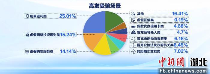 从高发受骗场景来看,2025年湖北省电诈高发案件类型前五依次为:刷单返利类占比25.01%、虚假网络投资理财类占比15.24%、虚假购物服务类占比14.14%、网络婚恋交友类占比7.02%、冒充公检法及政府机关类占比6.45%。