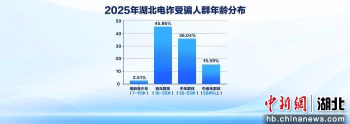 从受骗人群年龄来看,数据显示,2025年全省电诈受骗人中低龄青少年(7-15岁)占比2.51%,青年群体(16-35岁)占比45.86%,中年群体(36-55岁)占比36.04%,中老年群体(56岁以上)占比15.59%。其中,最小受骗者7岁,最大受骗者95岁。