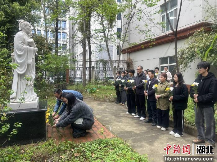 4月3日上午,在求索书院屈原塑像前,在“荆楚风流”与“玉兰学府”群体塑像旁,文学院师生代表为屈原、李白、苏东坡、鲁迅等文学巨匠的塑像拂拭尘埃,敬献素菊。师生们低首默哀,仿佛穿越时空,与先贤展开一场跨越千年的对话。