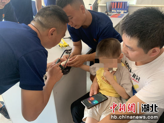 中新网湖北新闻7月23日电 (朱燕林 孟湾湾)7月22日,湖北省咸宁市通山县一名男子带一名3岁左右的男孩来到通山消防救援大队求助,称孩子前一天晚上洗完澡后拿着玩具玩时,将右手食指伸进塑料玩具孔洞里取不出来,目前手指卡洞里将近10小时,家人尝试多种办法都失败。
