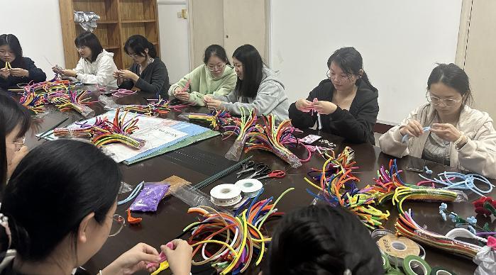 在随后的动手环节,学生社区瞬间变成了一个充满创造力的“社区疗愈工坊”。同学们围坐在一起,指尖飞舞,将五彩的扭扭棒变成一朵朵独具匠心的花朵。在轻松愉快的氛围中,大家相互交流、彼此帮助,不仅释放了学业压力,更在协作中增强了社区归属感。